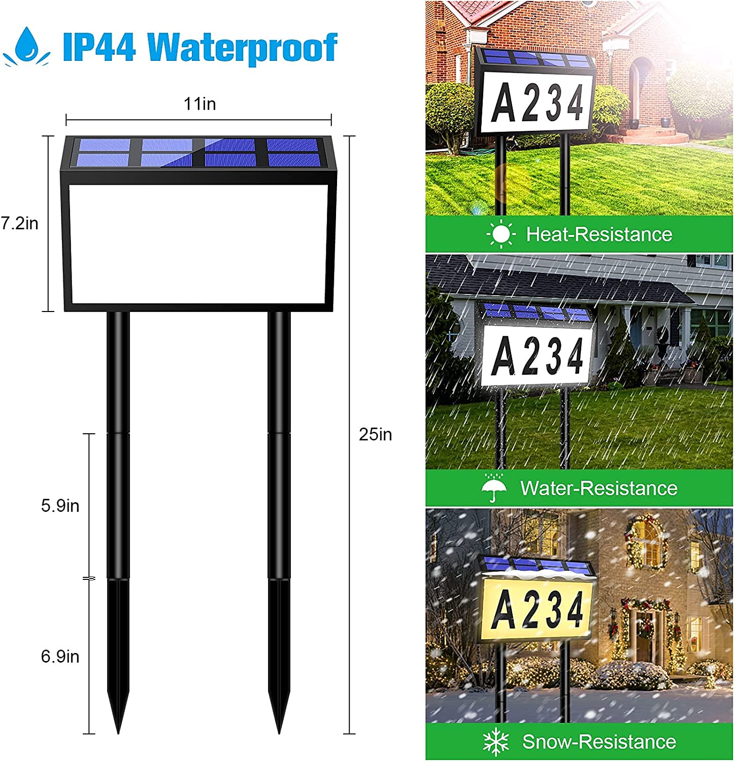 【Suitable for Outdoor】Our solar powered lighted house number sign uses amorphous solar panel, which can charge the pre-installed NI-MH battery with low winter sun or in moderately cloudy days. Waterproof shall is suitable for every season and any weather.